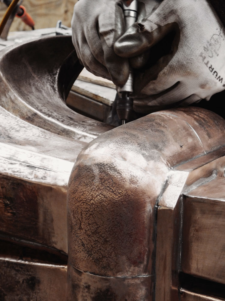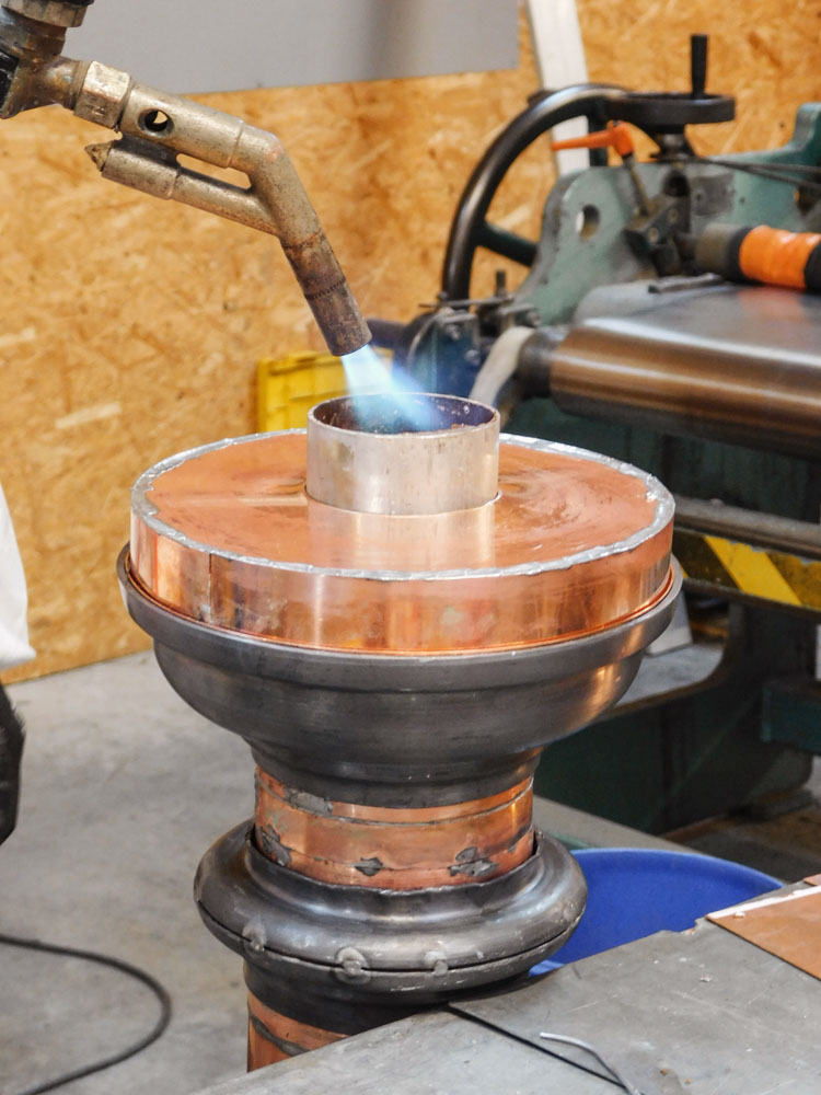 Au cœur de notre métier, le repoussage du cuivre est une technique ancestrale qui donne vie à des ornements de toiture en cuivre d’une rare beauté. Nos artisans, experts en technique de repoussage du cuivre, maîtrisent l’art subtil de sculpter le cuivre à la main pour créer des motifs complexes et des détails raffinés. Chaque objet d’ornement en cuivre témoigne du savoir-faire exceptionnel de notre équipe. Les détails des épis de faîtage en cuivre incarnent le summum de notre art. Non seulement ils ajoutent une touche d’élégance à chaque toit, mais ils sont aussi des symboles de prestige architectural. Grâce au repoussage cuivre, nous donnons vie à ces ornements en cuivre avec une précision méticuleuse, faisant de chaque pièce un véritable chef-d’œuvre. La pratique manuelle et la tradition et la transmission du geste confère à chaque décor force, caractère, histoire et identité.
