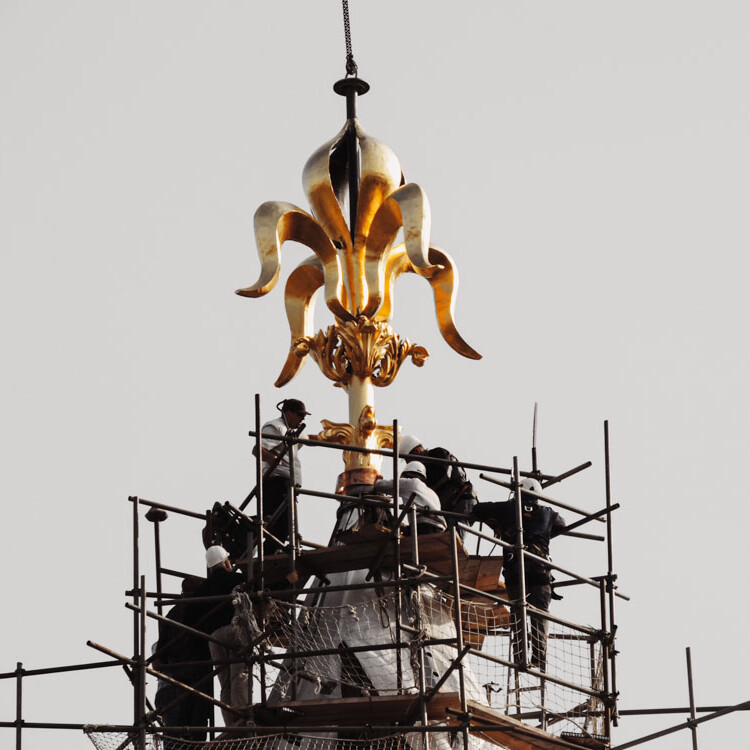 Façonnage et mise en place d'épis de faîtage en plomb d'une hauteur totale de 12 mètres